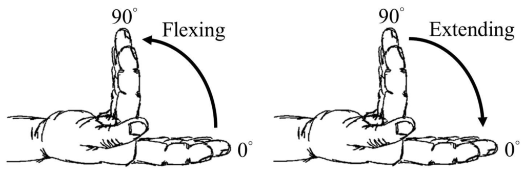 The subject was asked to outstretch the right arm with the palm up and the elbow flexed to 90° with the forearm during each experiment. Subsequently, the forearm was fixed to the bottom of a custom-made plexiglass tank filled with distilled water for ultrasound imaging. The four fingers (index, long, ring, and little) were maintained in the extension direction using a plate positioned on the dorsum aspect of the interphalangeal joints and a MicroporeTM tape placed across the proximal interphalangeal joints. The measured position was approximately at a 7.5 mm away from the level of the wrist crease. The ultrasonic radio-frequency (RF) signals and images of the wrist in the transverse-plane were collected, in which data corresponding to the flexion and extension movements of four fingers from 0° to 90° and 90° to 0°, respectively, with an increment angle of 5°, were acquired, as shown in Figure 1. The flexion angle of four fingers fixed on a plate was better controlled by a micro-stepping rotatory motor. A total of five repeat experiments for each subject covering movements between flexion and extension were performed.