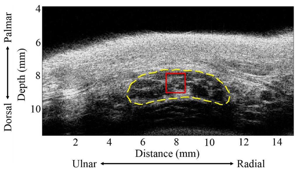 A high-voltage monocycle generator (AVB2-TB-C, AVTECH Electrosystems Ltd., Ogdensburg, NY, USA) was used to generate a 200 peak-to-peak voltage for the exciting transducer, and which was connected to an electronic expander (Matec Instruments Company, Northborough, MA, USA) to eliminate electrical noise. The received ultrasonic RF signals were connected to an electronic limiter (Matec Instruments Company) to protect the device from damage and then they were amplified by a low-noise amplifier (Model LN1000A, Amplifier Research, Souderton, PA, USA). Subsequently, signals were filtered by a bandpass filter (Model BIF-30, Mini-Circuits, New York, NY, USA) and then digitized by an 8-bit analog-to-digital converter (PXI 5152, National Instruments, Austin, TX, USA) at 200 MHz sampling frequency. The transducer was mounted on the piezoceramic motor (HR8, Nanomotion Ltd., Yokneam, Israel) for sweep scanning the image of the wrist at different locations in the transverse plane. In addition, the transducer was also allowed to flexibly move to two other perpendicular directions along the two axes of micro-stepping motors (CM1-C-17L30A, Cool Muscle, Osaka, Japan) equipped with actuators (KR2602A, THK, Tokyo, Japan). All of these motion stages were controlled by a motor controller (DMC-1842, Galil Motion Control Inc., Rocklin, CA, USA). The program for data acquisition and motor control was developed using LabVIEW software (National Instruments, Austin, TX, USA). The mean signal-to-noise ratio of acquired ultrasonic signals was 36 dB. The acquired digital signals were processed with a sequence of filtering, Hilbert transform, logarithmic compression, and gray scale mapping to form B-mode images with 42 dB dynamic range [29]. The size of a B-mode image is 15 mm × 7.5 mm, which is composed of 750 A-lines with 20 μm intervals.