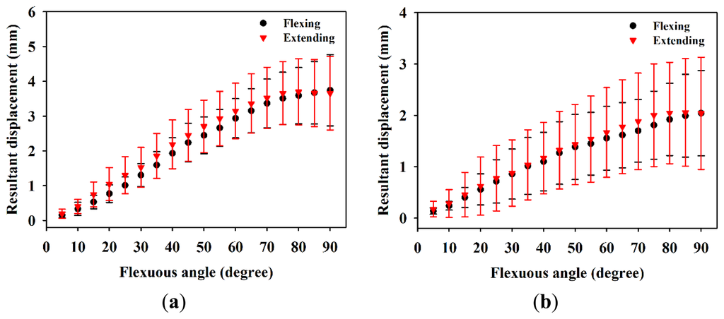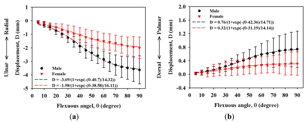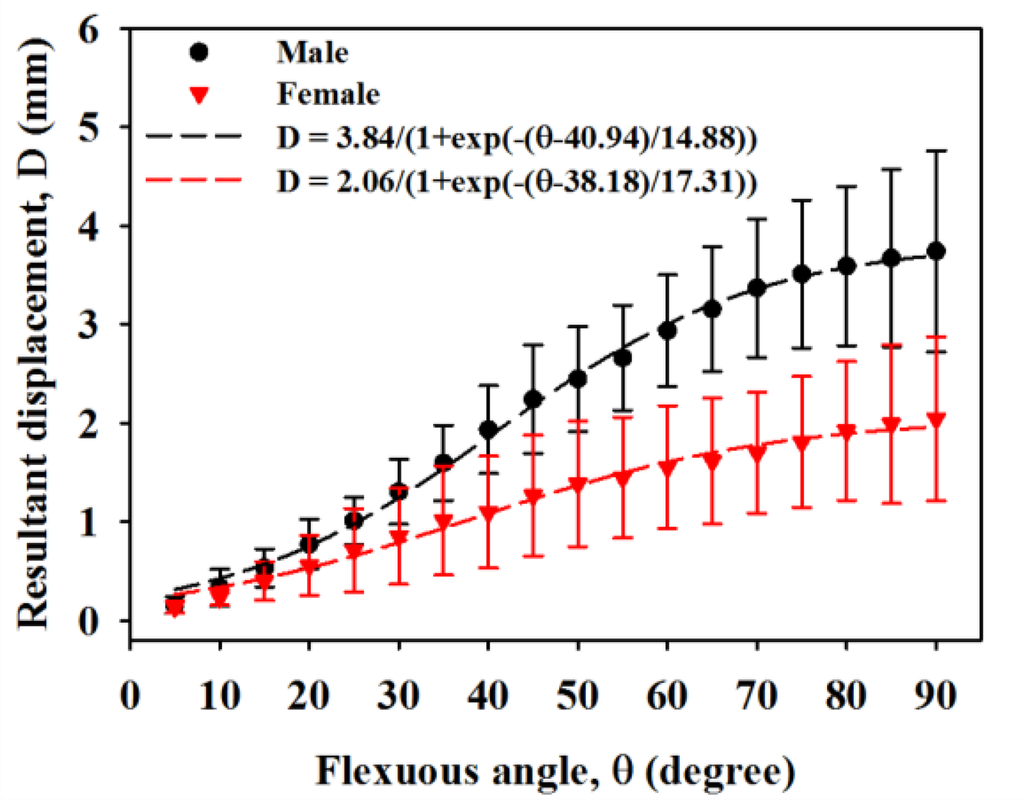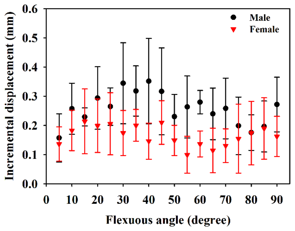 Figure 6 is the resultant displacement of the MN as a function of flexion angle, which shows that the displacement of male subjects in general increases faster than that of females. The kinetic trajectory of resultant displacement during finger flexing also generally follows the sigmoidal model with R-squares of 0.84 and 0.56 for male and female subjects, respectively. When the flexion angles is larger than 35°, the resulting displacements of the MN for male subjects tended to be much larger than those of females (p < 0.05). As the four fingers moved to 90°, the corresponding resulting displacements for male and female subjects were estimated to be 3.74 ± 1.02 mm and 2.04 ± 0.83 mm, respectively. Figure 7 shows the resulting displacements of the MN for male and female subjects as a function of flexion angle corresponding to flexing and extending finger movements, in which the resulting displacements are quite consistent between both movements. The incremental displacements of the MN in the total direction were found to range between 0.05 mm and 0.6 mm and between 0.02 mm and 0.4 mm for males and females, respectively, corresponding to the flexing of fingers from 0° to 90°, as shown in Figure 8. The average increment of the resulting displacement of the MN for males (0.26 ± 0.05 mm) was significantly larger than that for females (0.17 ± 0.04 mm) with a p-value of 0.005. The incremental displacements for males were larger than that for females for flexion angles between 30° and 70°.