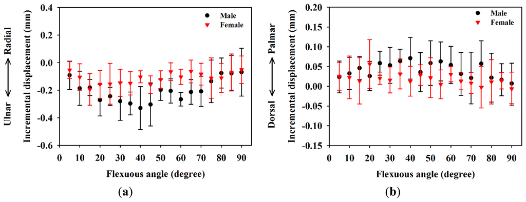 Following the movements of fingers flexion from 0° to 90°, male subjects show incremental displacements of the MN in the ulnar-radial direction between −0.6 mm and 0.2 mm, and those of female subjects are between −0.4 mm and 0.1 mm, as shown in Figure 5a. The average incremental displacement of the MN for male subjects (−0.20 ± 0.06 mm) in the ulnar-radial direction is significantly larger than that of female subjects (−0.11 ± 0.04 mm), where the p-value is 0.006. It also may be observed that the incremental displacements for male subjects are larger than those of females associated with the flexion angles between 30° and 70°. In response to the fingers flexing from 0° to 90°, the incremental displacements of the MN in the palmar-dorsal direction were measured to be between −0.12 mm and 0.17 mm, and −0.08 mm and 0.16 mm for male and female subjects, respectively, as shown in Figure 5b. The average incremental displacement of the MN in the palmar-dorsal direction did not show a significant difference between male (−0.041 ± 0.030 mm) and female (−0.018 ± 0.020 mm) subjects, with a p-value of 0.107.