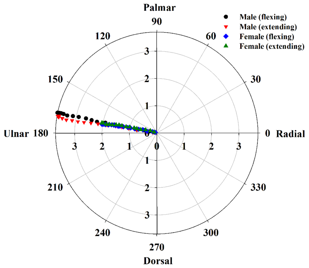 Furthermore, the average kinetic trajectories of the MN associated with flexion and extension movements of fingers for males and females are shown in Figure 9, in which the MN tends to move toward a constant direction following finger flexion or extension movements. The angles of movement direction of the MN for males were 167.9° ± 1.0° and 167.2° ± 8.5° during flexion and extension of fingers, respectively, and those of females were 168.7° ± 6.0° and 165.7° ± 6.7°, respectively In addition, both the MNs for males and females tended to show similar kinetic trajectories in response to finger movements between flexion and extension.