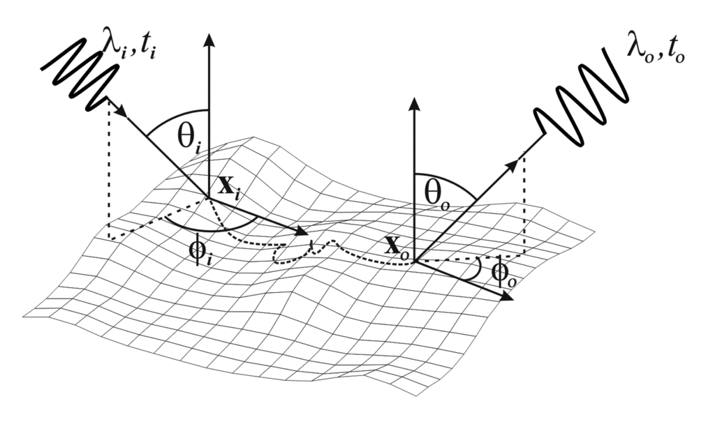 When neglecting the distribution of radiance over wavelengths and time, the scattering can be modeled using the 8D Bidirectional Scattering-Surface Reflectance Distribution Function (BSSRDF) [4]: