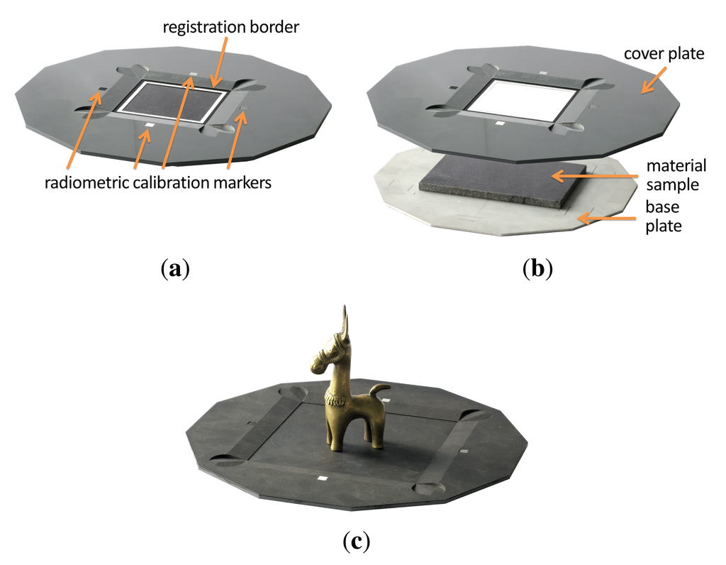 For this, our sampleholder consists of three distinct parts, a back plate, a base plate and a cover plate, depicted in Figure 7b. The cover plate and back plate are made from aluminium that was milled by a CNC mill. The black coating is achieved by airbrushing the parts with matte black blackboard paint. In contrast to other black spray paint we found the blackboard paint to show virtually no problematic direction depending highlights. A rectangular patch of the material is applied to the base plate made out of acrylic glass. The base plate is embedded into the cover plate, so that the surface of the material is on the same level as the cover. This is then fixated by four screws that penetrate the acrylic glass. Depending on the material, the sample is either held in place by mechanical pressure from the cover plate or it is glued onto the base plate.