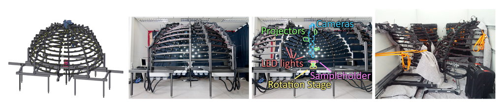 Examples of setups that also perform an integrated 3D shape acquisition to facilitate reflectance capture on curved surfaces can be found in all three categories.