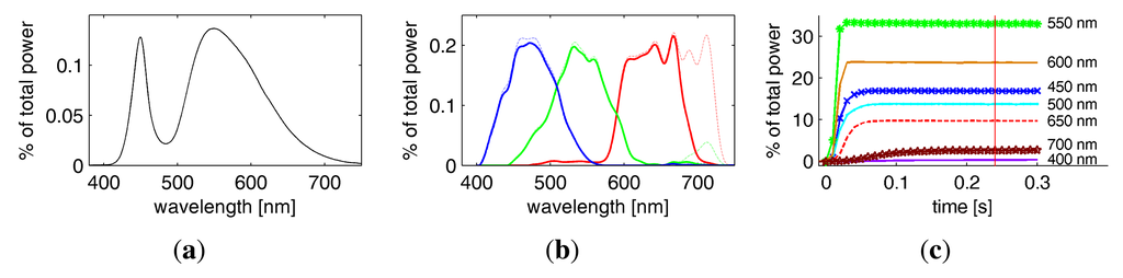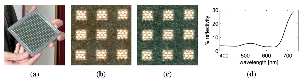 For performing hyper-spectral measurements [48] the setup is now equipped with a 4 Megapixel Photometric CoolSNAP K4 camera. The camera has a Peltier cooled mono-chrome CCD chip with 12 BPP, which is sensitive to electromagnetic radiation from 350 to 1, 000 nm. As the sensor is operated at approximately −25 °C, it exhibits a very low noise level despite the prolonged exposure times necessary to capture the low amount of radiance passing the narrow spectral band-filters. Thus, the cameras achieves approximately 32 dB dynamic range in a single shot. 32 different wavelength bands between 410 and 720 nm are sampled with a bandwidth of 10 nm via a CRi VariSpec multi-spectral tunable liquid crystal filter (see inset in Figure 4).