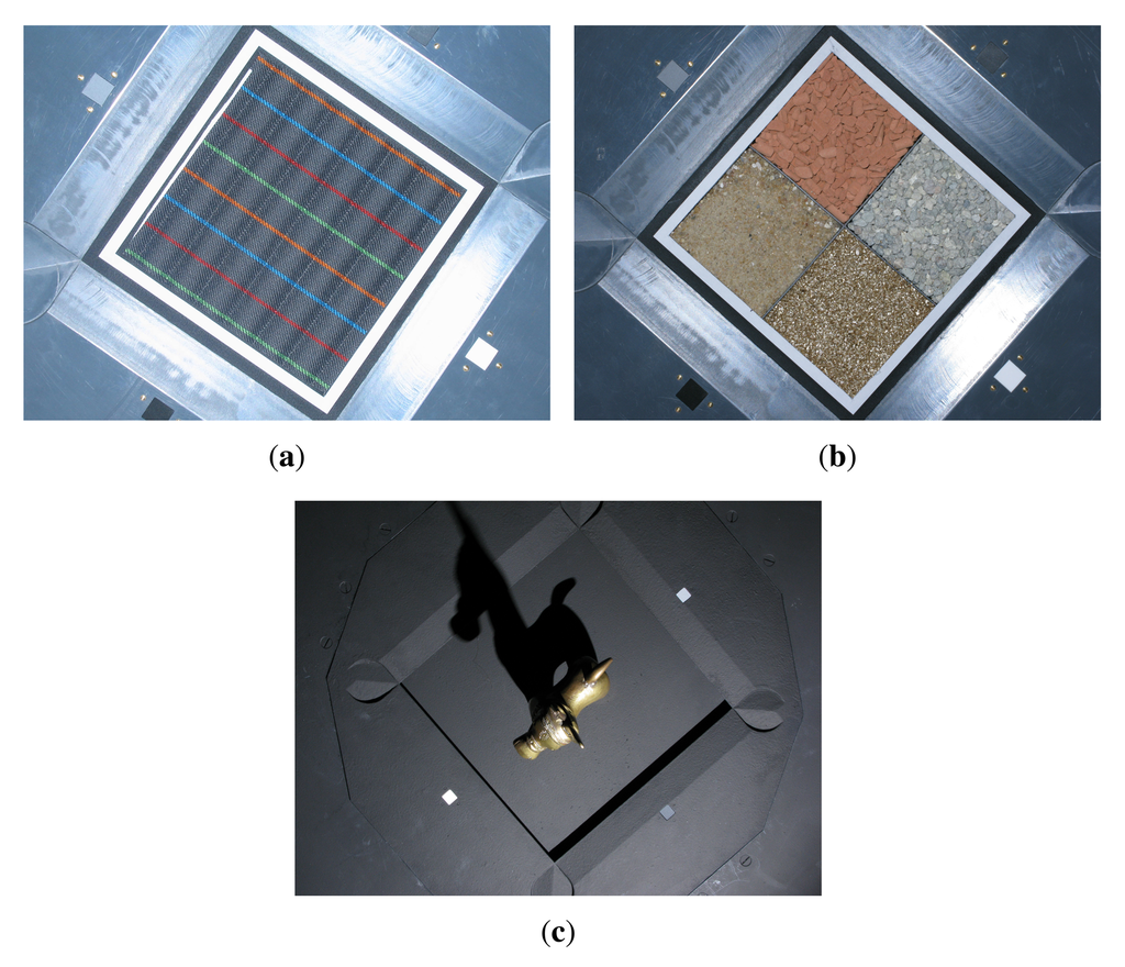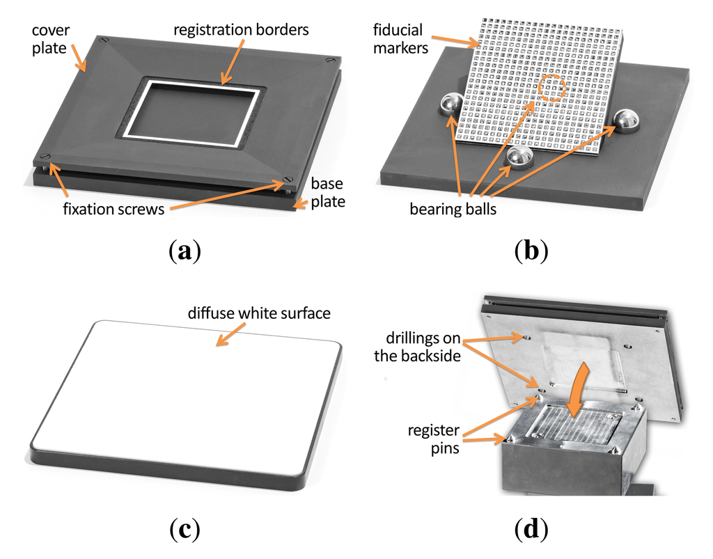Over time, several changes have been made to this design (see for example Figure 5). Most notably, the width of the cover plate and registration border has increased to avoid recognition problems during the automatic registration. The sides of the back plate were chamfered to avoid misdetection due to low contrasts under some light directions. Furthermore, the registration border, which originally were white colored stripes on the black cover plate, was separated to the back plate to show a more distinct edge. Eventually, for the spectral measurements in [48], an additional inset with registration borders was added.