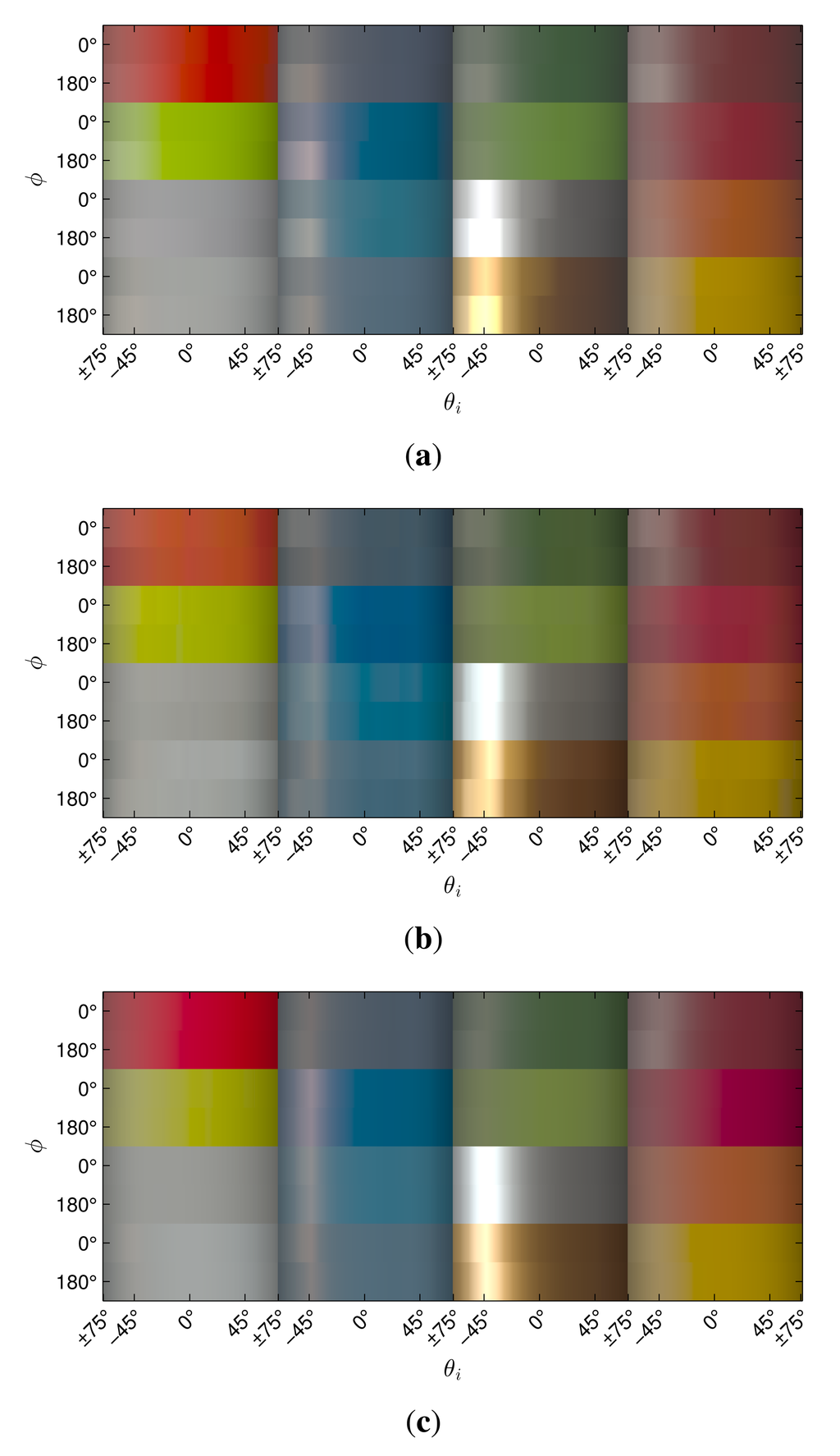 - Filip, J.; Vávra, R.; Haindl, M.; Žid, P.; Krupička, M.; Havran, V. BRDF Slices: Accurate Adaptive Anisotropic Appearance Acquisition. In IEEE Conference on Computer Vision and Pattern Recognition (CVPR); IEEE Computer Society: Washington, DC, USA, 2013; pp. 1468–1473. [Google Scholar]