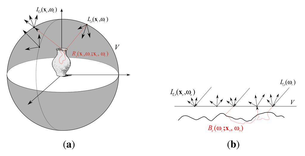 Note that the reflectance field is closely related to the BSSRDF S in Equation (2). When using the true surface as ∂V, both functions are identical. Yet, the approximation using a boundary surface makes the reflectance field easier to sample and reconstruct, as was attempted in [10,12–15] (The setup used in [15] has previously been published in [16]). In turn, this means that reflectance fields, and thus also BTFs, are completely eligible for use in optical light scattering simulations as if they were BSSRDFs. The only restriction is that all scattering events occur outside and on the bounding volume. The light scattering within the bounding volume is already encoded in the reflectance field and does not need to be simulated.