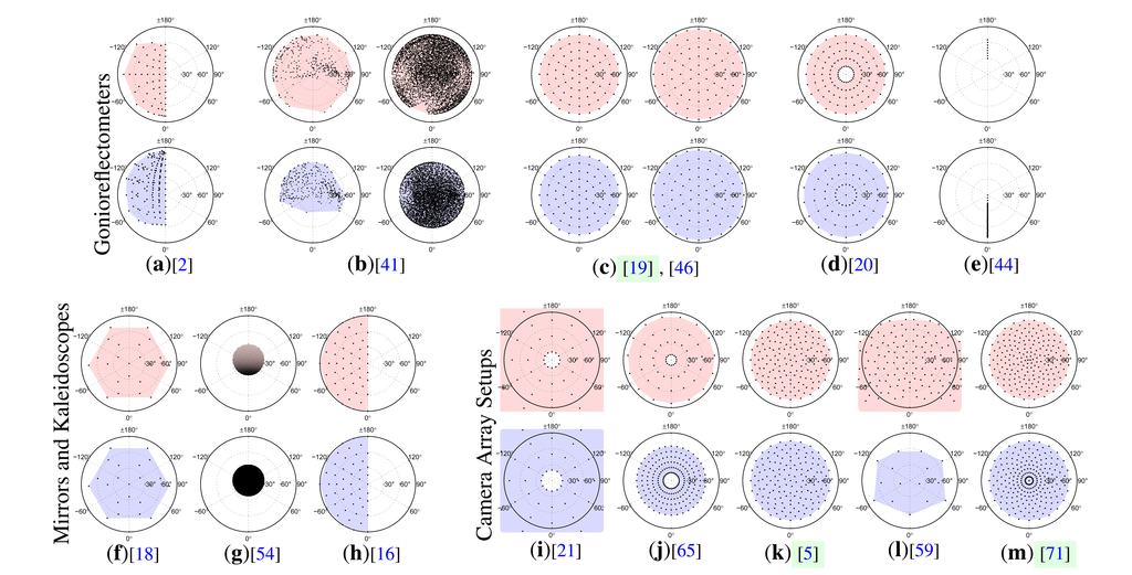 - Schwartz, C.; Sarlette, R.; Weinmann, M.; Klein, R. DOME II: A Parallelized BTF Acquisition System. Proceedings of the Eurographics Workshop on Material Appearance Modeling: Issues and Acquisition, Zaragoza, Spain, June 2013; pp. 25–31.