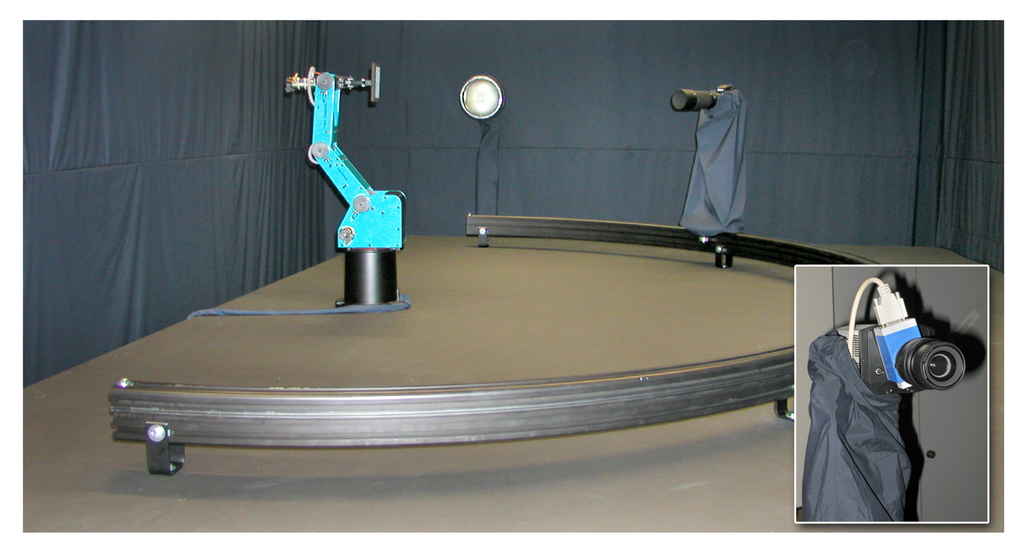 Our gonioreflectometer setup (see Figure 4), published in [5,19,47,48], was constructed between 2001 and 2002 to allow spatially varying and bi-directional measurement of material appearance from flat samples. It was extended in 2009 and is since then equipped to perform hyper-spectral measurements.