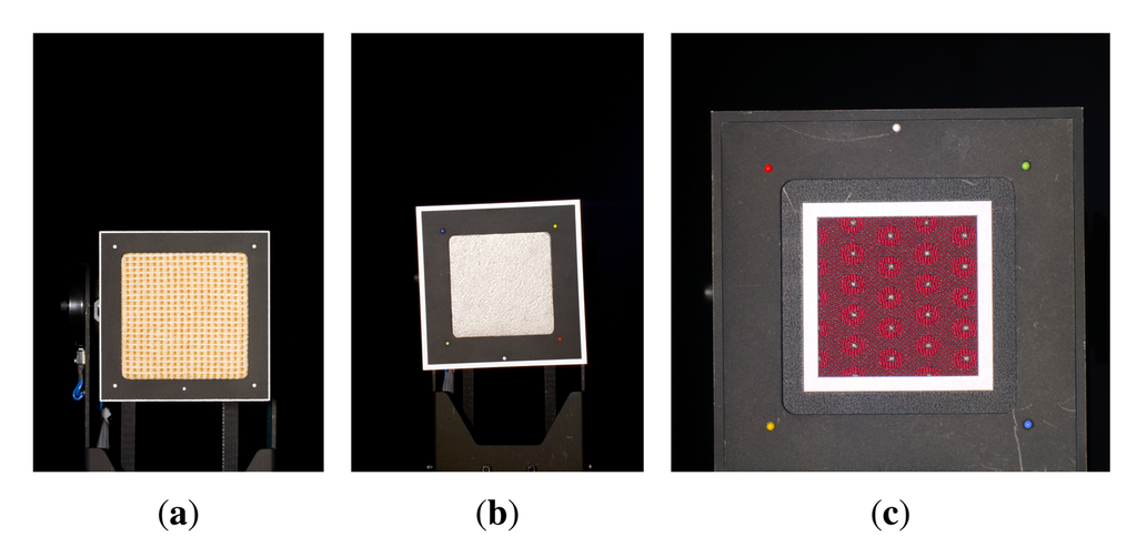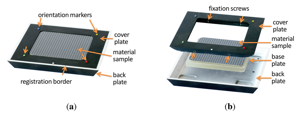 The material sample that is presented to the camera is held tightly in place by a separate bespoke sampleholder that is grasped by the robot. Thus, the material can be prepared without a hustle prior to acquisition. The sampleholder has to meet multiple requirements: First, the sample has to be held tight enough, not too move or change shape even in a headlong position. Second, the maximum size is restricted by the robot's working envelope but has to be large enough to contain the spatial variations of the captured material. Thirdly, it should facilitate automatic registration and postprocessing of all captured images.