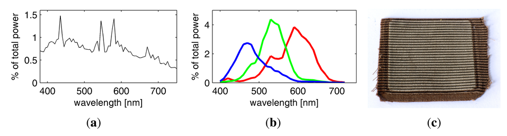 As a light source, we employ a full-spectrum Broncolor F575 lamp with a 575W Osram Hydrargyrum Medium Arc Length Iodide (HMI) bulb. We use a parabolic reflector to achieve a directional light characteristic, so that the incoming directions ωi are approximately the same at every point on the sample surface. After initial experiments, a UV filter was added to prevent damage of the material sample (see Figure 6c) from the prolonged exposure of several hours necessary for full BTF measurements. Still, the lamp shows an even distribution of energy across all wavelengths considered by the RGB Bayer pattern CFAs or the spectral filter (see Figure 6) and has a color-temperature of 6, 000 K. This facilitates to capture a natural impression of the reflectance with color characteristics comparable to day-light illumination when employing the RGB sensors of the Kodak DSLRs.