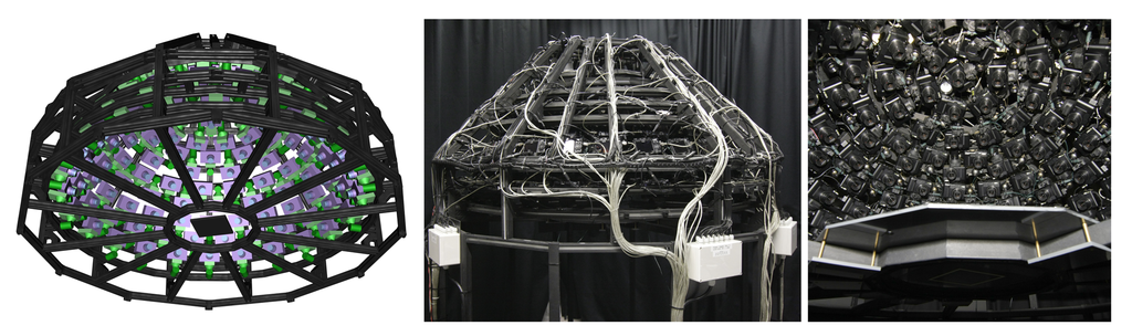 We will present two camera array setups that we implemented ourselves in Sections 6 and 7. We denote the setups as Dome 1 and Dome 2. The first one [5,22,23,72] consequently follows the approach of simultaneous view direction acquisition, capturing the full outgoing light field at once with a large number of cameras. The second one [71,73,74] implements a semi-parallel acquisition, using fewer cameras in combination with a turntable.