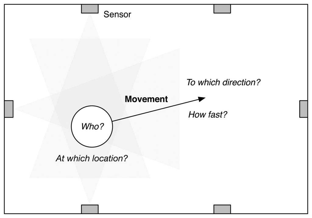 In order to build a smart environment where systems could understand the activities a user is involved with and the surroundings and then adapting their services and resources to the user's context, we need to develop a robust motion detection and tracking system using various sensors. Many researchers have devoted their efforts toward building robust motion tracking systems using vision-based sensors, i.e., cameras. The research projects based on vision-based sensors mainly consider position, speed, direction, shape and size (i.e., the number of pixels in cameras) as the principal context for idengifying the users and understanding their activities [23]. Accordingly, as shown in Figure 1, a motion tracking system will need to robustly detect: (1) the identity of the moving object; (2) at which location the object is; (3) to which direction the object is moving; and (4) how fast the object is moving. We next consider the sensing systems for human movement detection and idengification for building a robust motion tracking system.