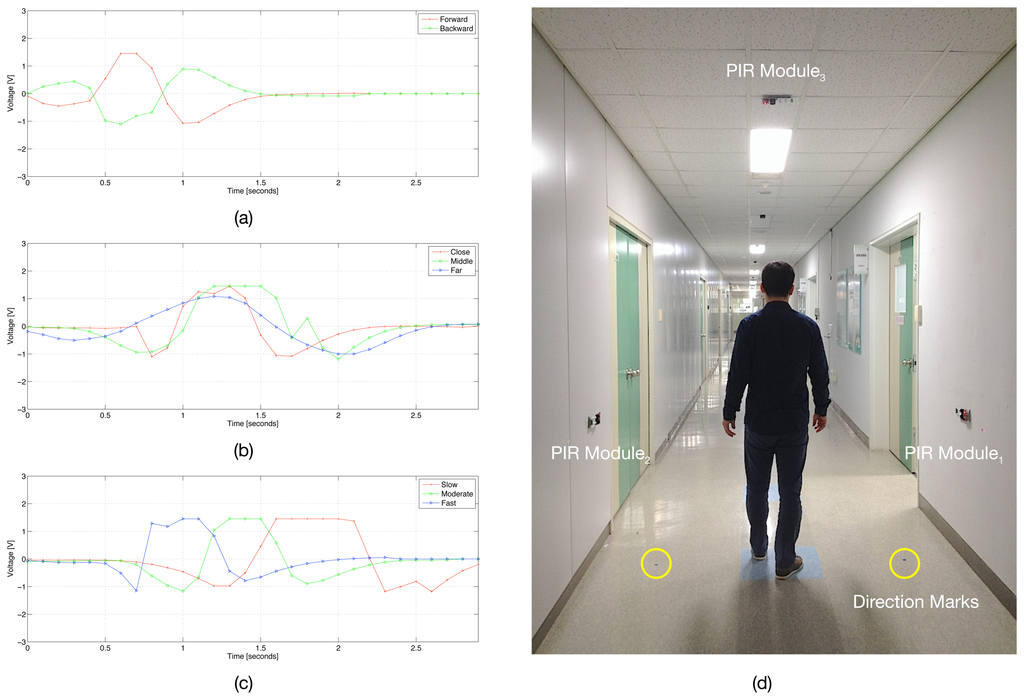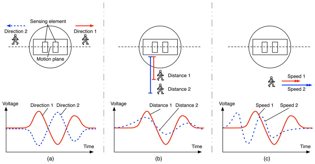 Figure 2 is a schematic presentation of a PIR sensor having two sensing elements aligned in a motion plane and its output signal captured in the case of walking: (1) in different directions; (2) at different distances; and (3) at different speed levels. The graph from Figure 2a shows that by alternating the polarities of the sensing elements in a PIR sensor, we can discriminate between the two signals captured according to the relative directions of walking, i.e., left to right and right to left, and subsequently to obtain the clear direction information of the moving object. Similarly, the graphs from Figure 2b,c show that by using the different output signal patterns (e.g., amplitude and time to peaks), we can discriminate between the two signals captured according to the distances of the human body from the PIR sensor and the speed levels of the walking human, i.e., close/far and slow/fast; and subsequently, to obtain the clear distance and speed information of the moving object. Finally, with all these aspects, we can imagine a way of idengifying the moving object based on a human movement detecting device composed of a set of PIR sensors. Therefore, the main result of this paper is to demonstrate a way of detecting human movement and idengifying subjects based on a human movement detecting device composed of a set of PIR sensors and to discuss the experimental results according to direction, distance and speed estimation for human movement and, finally, human idengification.