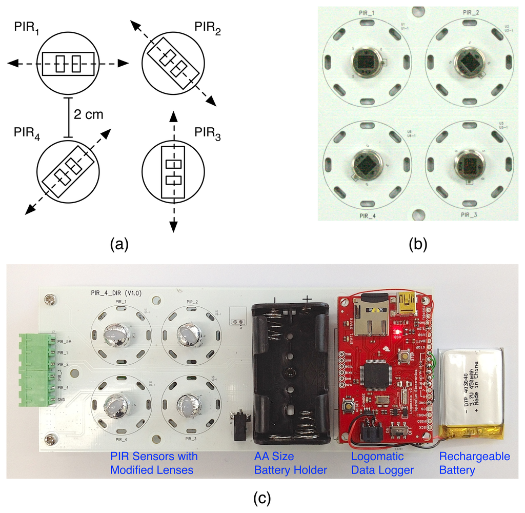 Accordingly, for our experiments, we have created a human movement detecting device based on two pairs of PIR sensors orthogonally aligned, as shown in Figure 3. The human movement detecting device consists of two pairs of PIR sensors, a Logomatic v2 Serial SD data logger from SparkFun Electronics, a rechargeable battery and a custom-fabricated data acquisition board. Figure 3a shows a schematic diagram of a set of four PIR sensors whose sensing elements are each oriented at W-E, NW-SE, S-N and SW-NE angles, and Figure 3b is a top view of the four PIR sensors we have implemented. PIR sensors are separated by a 2-cm space considering the Fresnel lens setup, which is able to shape the field of view of PIR sensors. We have used IRA-E710 PIR sensors from Murata Manufacturing Co., whose vertical and horizontal field of views are both 90° [26]. Because IRA-E710 PIR sensors output a low analog voltage signal, we have developed op-amp circuits to amplify the low PIR output signal. To acquire amplified PIR sensor signals, we have created a printed circuit board (PCB) having PIR sensors and op-amp circuits, whose outputs are connected to the analog inputs of a Logomatic v2 Serial SD data logger. The Logomatic v2 SD data logger is configured to record each analog input as a time series on a 2 GB micro-SD memory card, with a sampling rate of 10 Hz. It is already known that a 10-Hz sampling rate shows the best performance in human activity analysis based on PIR sensor-based systems [21]. A rechargeable battery can continuously power four PIR sensors and the data logger during data collection. We can also power the data collection module with two AA batteries.