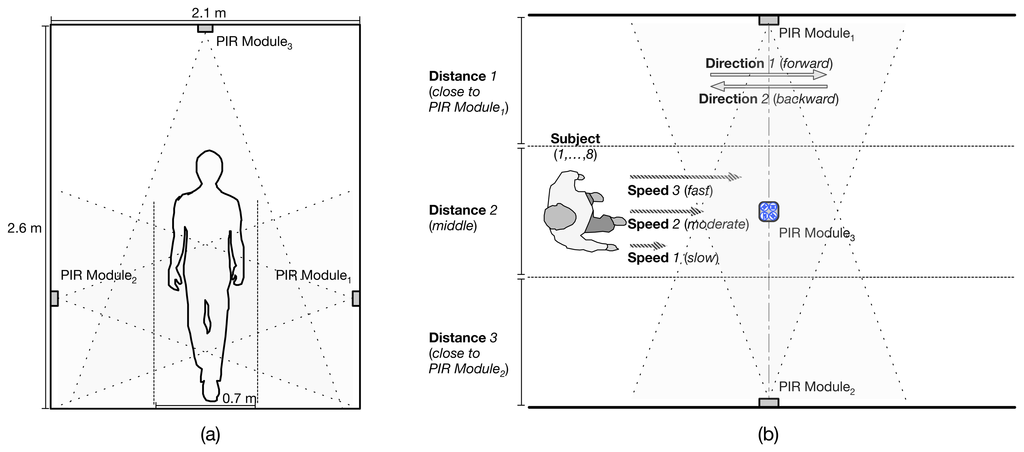 We have collected PIR sensor signals from eight experimental subjects. The average height of the subjects is 170.67 cm, and the standard deviation is 5.22 cm. The average weight of the subjects is 69.22 kg, and the standard deviation is 8.32 kg. Each participant is asked to walk through the monitored field equipped with three PIR-based modules in three different conditions: direction, walking in two different directions (i.e., forward and backward); distance, walking at three different distances from PIR modules (i.e., close to PIR Module1, middle, close to PIR Module2); speed, walking at three different speed levels (i.e., slow, moderate, fast), as shown in Figure 4b. All subjects are asked to walk as normally as possible within the range of their daily walking style. For each experimental condition—direction, distance, speed—we have captured 10 walking samples from each participant and, finally, collected a total of 1,440 (= 8 subjects × 2 directions × 3 distance intervals × 3 speed levels × 10 passages) walking samples.
