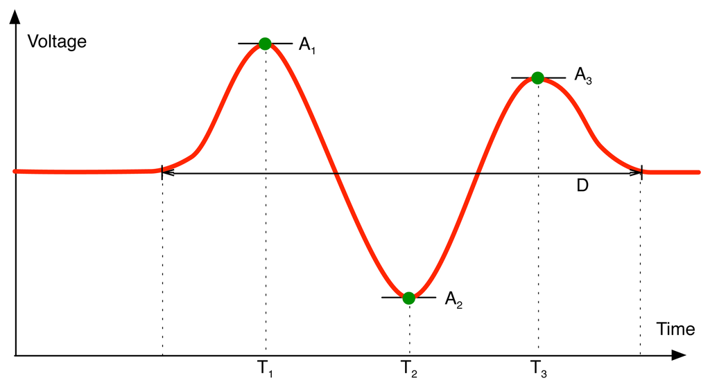 However, it is already known that the signal amplitude (the difference between the maximum and minimum value of the PIR output) and the passage duration (the time during the PIR output exceeds custom thresholds) can be used as a feature set to classify the distance of movement from the PIR sensors [15]. They also used a peak detection method (one positive and one negative) to recognize the direction of movement. It is also presented that the amplitude values of three peaks in PIR signal can be used as a feature set for classifying walking directions [16]. Accordingly, as shown in Figure 6, we have decided to employ a reduced feature set consisting of amplitude (A1, A2, A3) and time (T1, T2, T3) to three peaks and passage duration (D) for a PIR sensor for our classification analysis. In this case, assuming that we use all four PIR sensors of each of three PIR-based modules, a feature set for a walking sample is composed of 84 features (= 3 PIR-based modules × 4 PIR sensors/PIR-based module × 7 features/PIR sensor).