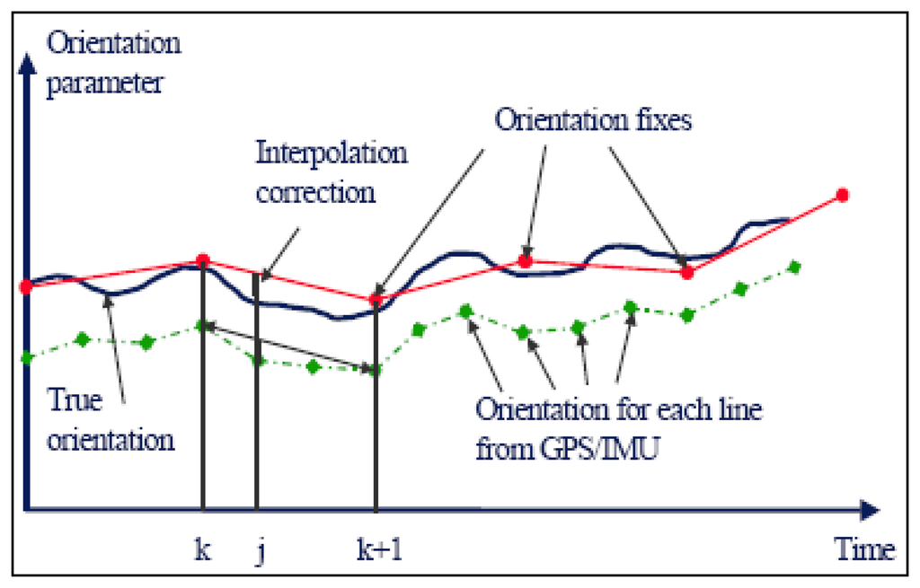 During the adjustment process, (XSj, YSj, ZSj, ωj, φj, κj) can be calculated by the EOPs of two adjacent orientation images and the correction values which can be derived by GPS/IMU observations. A variable Cj is introduced to represent the relationship among the EOPs at time tj and the EOPs of the adjacent orientation images at time tk and tk+1:
