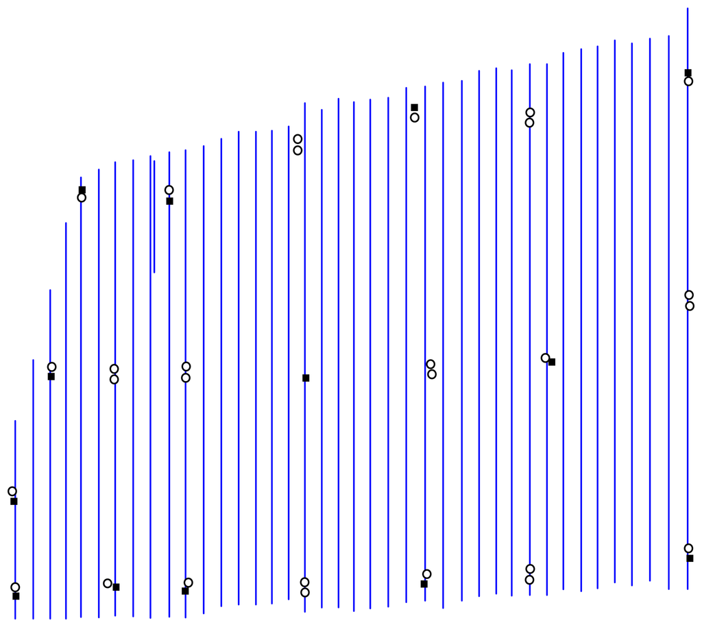 To fully demonstrate the advantages of using the ω-φ-κ system against the quaternions, a large project with 41 ADS40 strips that covered more than 7,000 km2 was used for experiments. The project was located in Henan Province (China). The 41 strips' images with 0.45 m GSD were acquired by three flight missions. The amount of automatically matched conjugate points by DPGrid was more than 300,000 for this test dataset. There were 41 field measured ground points, in which 13 points were used as GCPs and the other 28 points as check points in the bundle adjustment as shown in Figure 2. The size of absolute orientation files (*.odf), which contained the exterior orientation elements of each scanner line, was about 874 MB. There were totally 4,312 orientation images by using the orientation image model with 8 s intervals. The band width of unknowns was 2,196 after optimization. Consequently, the needed memory to store the coefficient matrix of the normal equation was about 434 MB (4,312×6×2,196×8/1,024/1,024 = 434 MB). Our proposed approach and developed software was capable to deal with the large dataset as a whole project with both systematic error compensation model and orientation image model and both gave stable and similar bundle adjustment results. The result of bundle adjustment with orientation image model was listed in Table 5. The RMSE of height residuals was about 1.0 GSD, and the maximum residual in height was about 2.0 GSD. There was no stereo view hardware available while performing this experiment, so it was not possible to precisely measure the image points under stereo view environment. Although the height accuracy was comparatively lower than those of the other three test fields because the image coordinates of GCPs and check points were not precisely measured, it still qualified for the requirements of topographic mapping at scale 1:5,000 in China.