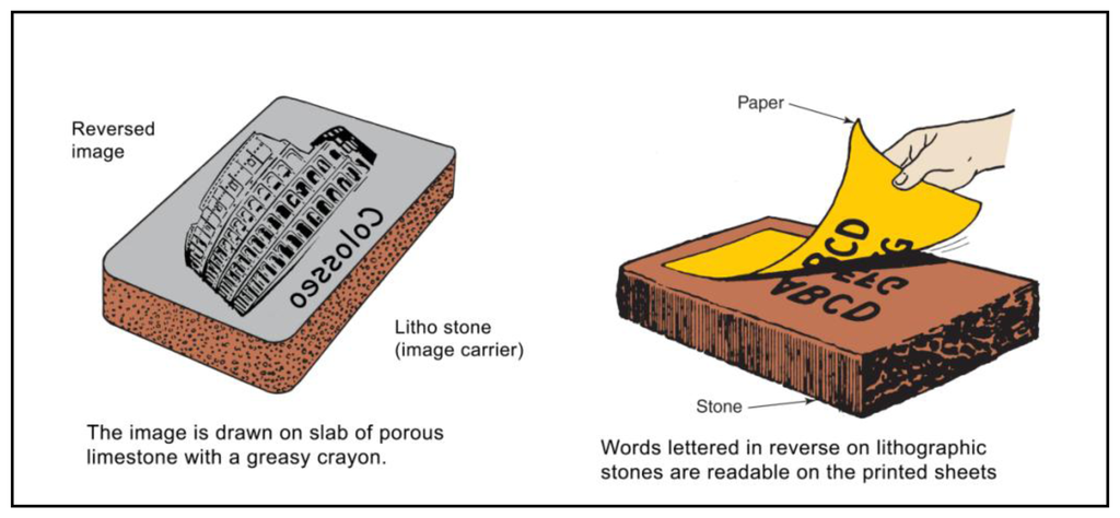The term lithograph or lithography comes from Greek, meaning “writing with stone”. The German Alois Senefelder [8] invented it in 1798. The technical process of lithography is based on the principle that limestone is naturally attracted to oil, and that oil and water have a natural antipathy, refusing to mix each other. A simplified version of the process is the following: (1) the artist draws an image on lithographic stone with a greasy crayon; (2) the stone is moistened with water. Parts of the stone not protected by the grease soak up the watert (3) oil-based ink is rolled onto the stone. The greasy parts of the stone pick up the ink, while the wet parts do not; (4) A piece of paper is pressed onto the stone and the ink transfers itself from the stone to the paper [9,10]. Figure 1 explains the procedure described above.