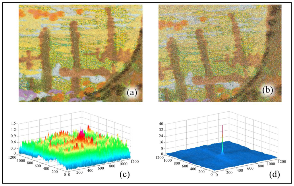 To verify the robustness of the proposed system, we have digitally applied Salt and Pepper noise to the acquired image, which degrades the resulting Cα(peak) values; in any case, the resulting value is still over the threshold Tα. In Figure 10c,d are also drawn Cα with and without geometrical transformation, to highlight how significantly it changes in the two cases. Table 1 reports the phase correlation peak value Cα(peak) for the different added noise and the related necessary parameters. There are also reported in the different statistical threshold values for a set of possible thresholds.