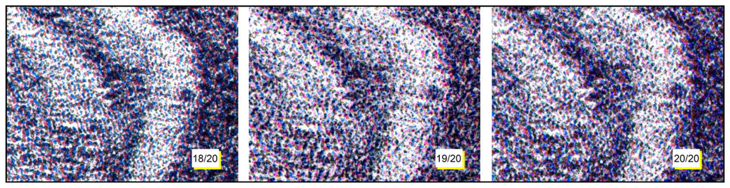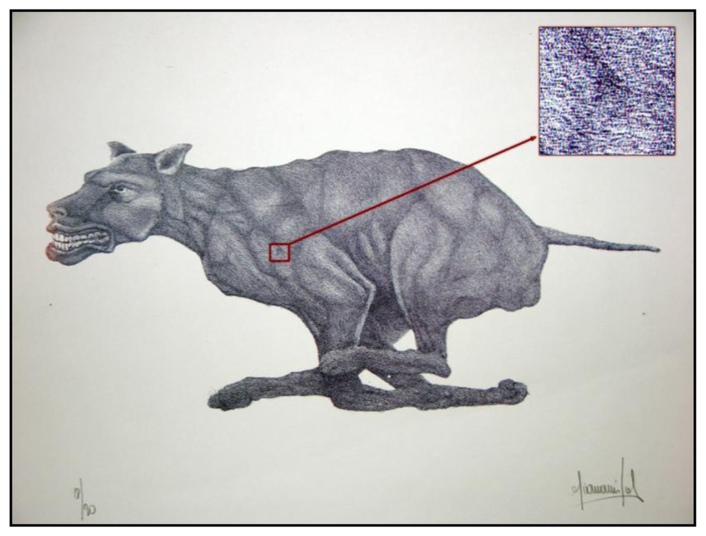 In Figure 12, three different lithographs of the same series (Giovanni Job's Dog 18/20, 19/20 and 20/20), are shown. Applying the system to them, it is demonstrated that they are different, even if the reported particulars could seem identical. This difference is due to the technique used to create a stone lithograph: to obtain color lithography, three subsequent impressions are made, using three different stones. It is impossible to place the three stones in exactly the same position; therefore, each copy is slightly different from the others. Then, using as hylemetric characteristic the positions of the colorful stains, the system is able to identify them as different copies. In this case, we obtained low Cα(peak) values (compared with the ones obtained in case of using the same lithography): Cα(peak) = 2.01 in case of lithography 18/20 compared with 19/20; Cα(peak) = 2.76 in case of lithography 18/20 compared with 20/20; and Cα(peak) = 2.46 in case of lithography 19/20 compared with 20/20. In these tests, according with Equation (3) we have a verification threshold equal to 3.55.