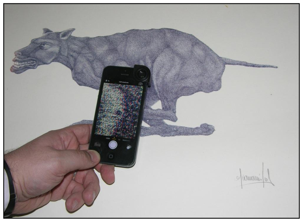 To certify a lithograph's authenticity by means of hylemetric identification, it is necessary to acquire a unique, non-repeatable and immutable characteristic, as previously defined. In this paper, the non-repeatable and immutable characteristic is the colorful “stains”, acquired by means of a smartphone. Therefore, with the potentiality offered by modern smartphones referring to processor power and image elaboration, these can be easily transformed into excellent biometric (hylemetric) sensors [15]. The smartphone used in this paper is a common iPhone 5 equipped with an Olloclip® 10× macro lens system. Figure 4 shows the smartphone system during the acquisition.
