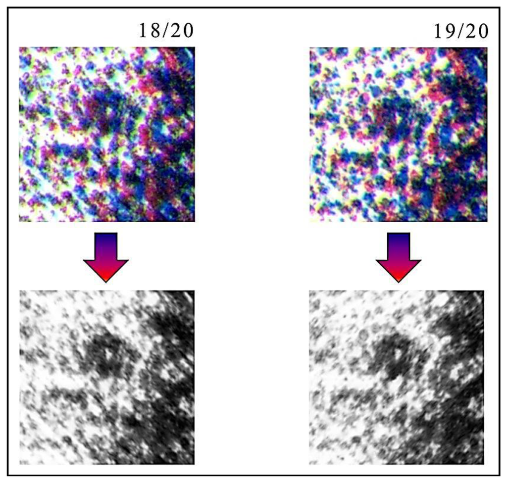 Subsequently, the colorful “stains”, acquired in RGB 24 bit format, are transformed to a uniform CIELAB color space [16]. After that, we use only the L channel, normalized with dynamic 0 to 1. In this way, we are sure that the obtained image is not affected by the environmental illumination. The obtained image has a typical speckle-like structure. This procedure is a one-way function, defined in the following as Hylemetric Hash Pattern (HHP). The Hylemetric Hash Patterns, extracted from the two Job's Dog Lithography, are shown in Figure 5.