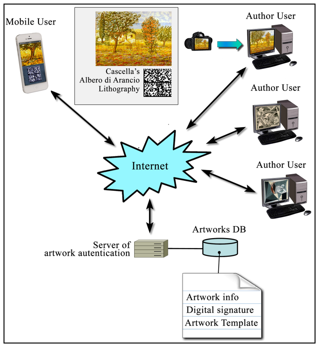The author (or the certification authority) decides which part of the artwork has to be acquired. This is acquired at High Definition; in this way it is possible to extract the related HHP. The HHP is sent, with the artwork information and the author digital signature, to a centralized Artwork Digital Archive (ADA) server. The ADA software generates a unique artwork identification number and a dedicated Universal Resource Locator (URL), where the Digital Certificate is deployed. This process is similar to the digital object identifier (DOI) schema [17]. A DOI is a character string (a “digital identifier”) used for uniquely identifying an object such as an electronic document. Metadata about the object is stored in association with the DOI name and this metadata may include a location, such as a URL, where the object can be found.