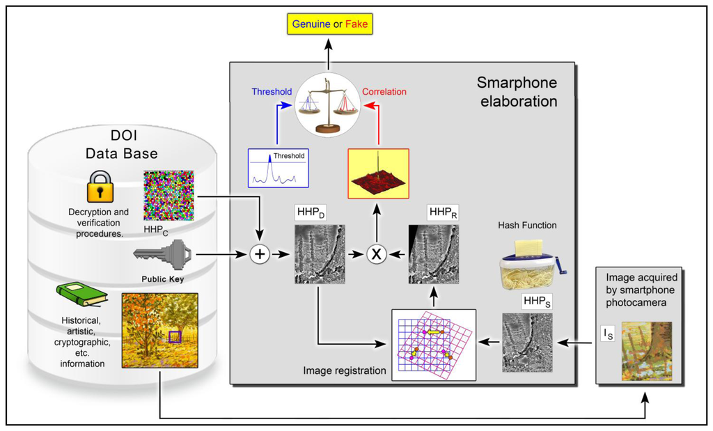 In the URL, memorized in the barcode, will be possible insert all the lithography and author information, both technical and biographical, with the template (i.e., the HHP and the information on the acquisition area), necessary to online authenticity verification. During this online verification, the smartphone, using a dedicated app (the common term for a smartphone application), acquires the barcode, decodes the content inside, goes to the indicated URL and retrieves the low definition image of the acquisition area, with the template. At this point, using the same app, the verifier acquires an area as similar as possible to the one reported in the low definition image, using the camera sensor available on the smartphone, and calculates the related HHP. At this point the smartphone app will be able to compare the two templates (the one retrieved by the ADA URL and the locally calculated one) and report the authenticity result. The schematic procedure is shown in Figure 6.