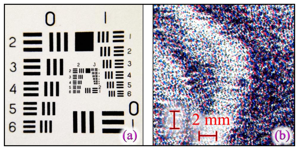 In our experiments, we have used an Apple© iPhone 5 equipped with an Olloclip® macro 10× lens, able to acquire an area of about 15 × 15 mm with a resolution better than 14 lines per mm (∼350 dpi). Figure 8a shows the USAF 1951 resolution target acquired by the iPhone 5 with Olloclip® macro 10× lens used. Figure 8b shows a lithograph particular, captured under the same conditions. From these figures is easy to understand that the smartphone used has the ability to acquire the necessary textures used in the non-cloneable HHP creation. In fact, the typical lithography structure has color stains with dimensions more than 0.1 mm, which allows defining a necessary acquisition resolution better than 250 dpi.