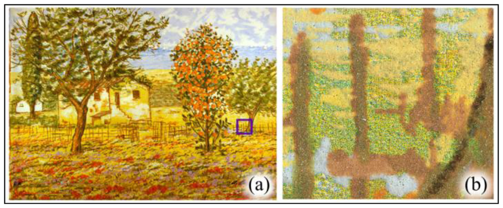 In this section some experimental results are reported. Figure 9 shows Cascella's lithograph Albero di Arancio. In our experiments, we used this particular lithography because it was the subject of forensic analyses in which we were involved as investigators. Figure 9a shows the lithograph with the zone used for certification highlighted. In Figure 9b the authentication zone acquired by means of the smartphone (IS) is shown.