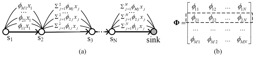 For data collection Wireless Sensor Networks (WSN), since sensor nodes are always densely distributed, there exists abundant redundancy in data from neighboring nodes. During the data collection process, besides how to route data to the sink, one of the key problems is how to remove redundancy and improve energy efficiency. There are a large number of algorithms that have integrated data compression into data collection [1–6]. Work described in [1,2] uses aggregation functions (e.g., Max(·), Min (·), Average(·), etc.) to extract the required information during data routing. However, while data size is reduced, data structure is lost. In [3,4] the authors adopt lifting schemes to compress data during routing. These schemes need to exchange intermediate coefficients between nodes during compression, which results in a waste of energy. Many traditional data compression algorithms such as KLT [5], wavelet [6], data mining [7], have been used in data collection. These algorithms have high computational complexity, and are difficult to integrate with routing processes. Compressed Sensing (CS) [8] is a new emerging theory in signal processing which has promising prospects to be applied in WSN [9–16]. Firstly, in CS, data sampling and compression can be integrated harmoniously into one step, which meets the requirements of WSN energy efficiency. Secondly, in compressed sensing, the computational complexity of decoding and encoding is highly asymmetrical; encoding complexity is very low, which implies a limitation for sensor nodes with weak computational power and limited energy supplies. Finally, during the encoding process in CS, no original or intermediate data is required to exchange among nodes, which is beneficial for distributed sensor network design.
