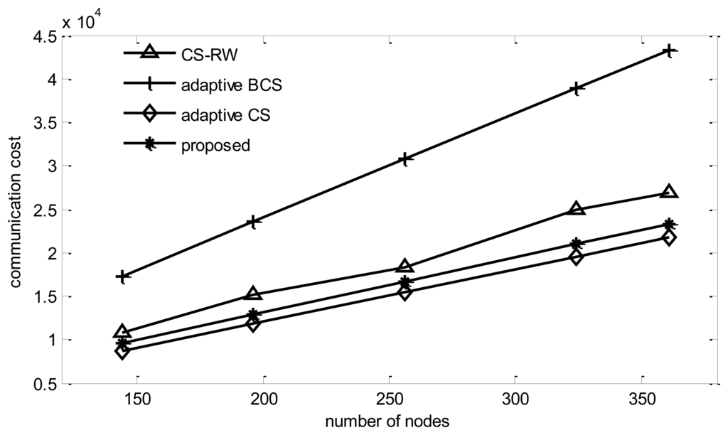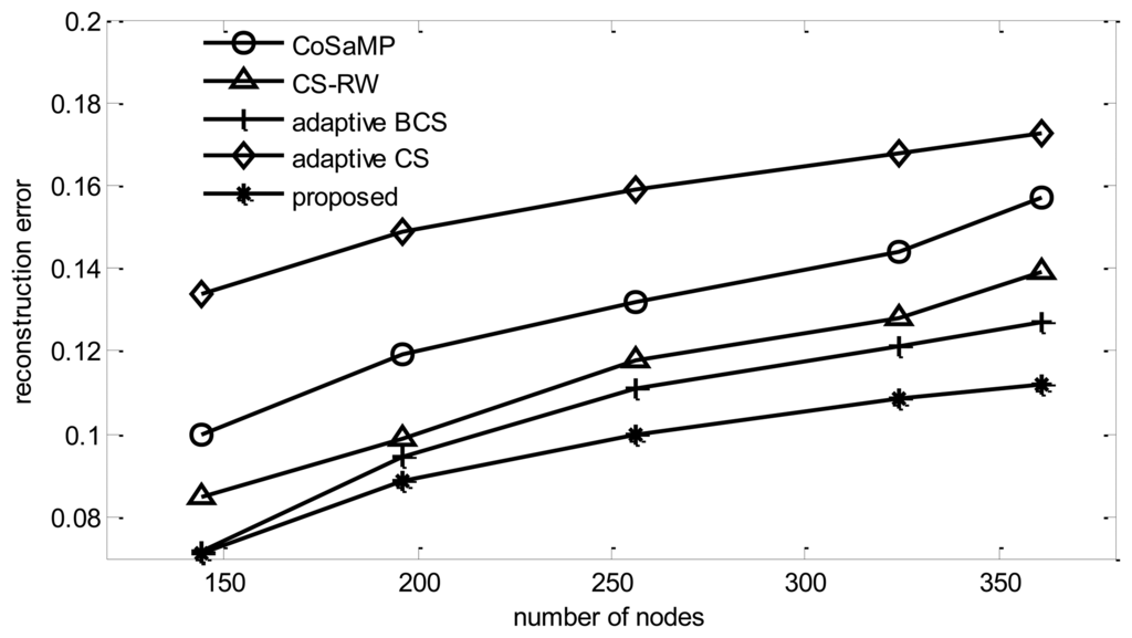 Assume nodes are uniformly distributed. The sink is located at the center of the area. The normalized communication radius of each node is rc, rc = 1.5. Assume the communication media is ideal, with no channel noise or access collision. To evaluate the proposed algorithm, three related algorithms are selected as reference, including adaptive CS [16], adaptive Laplace BCS (adaptive BCS) [20], and Compressed Sensing with Random Walk routing (CS-RW) [21].