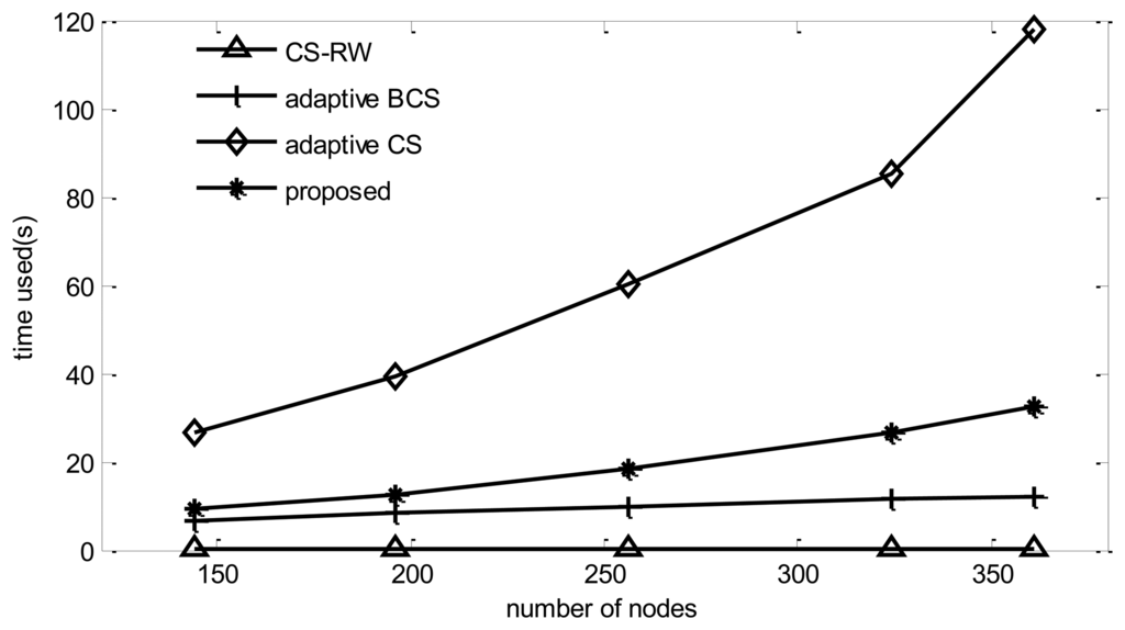 Since CS-RW does not use the adaptive mechanism and only needs to perform one reconstruction procedure, its simulation time is the lowest among the four algorithms. Adaptive BCS performs one reconstruction for each collection round, so its simulation time increases dramatically compared to BCS, while the adaptive CS, in addition to performing the reconstruction for each collection round, should calculate routing and projection vectors, so its simulation time increases dramatically with the number of nodes. From Figure 11, it can be found that the computational complexity of the proposed algorithm is much lower than that of adaptive CS.