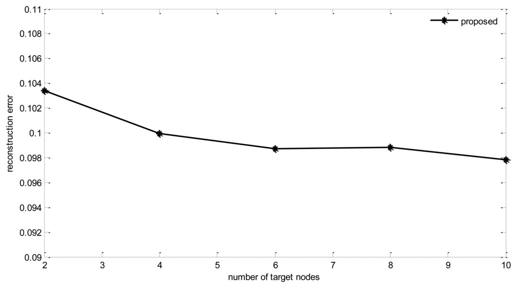 It can be found that with the increase of target nodes, there is some degree of decrease in reconstruction error. However, the communication cost increases rapidly too. From the figure we can find that, when target nodes increase from 2 to 10, communication costs increase by 12%, while the reconstruction error only decreases 0.6%. Therefore, a proper number of target nodes should be selected. In the simulations, this number is fixed at four.