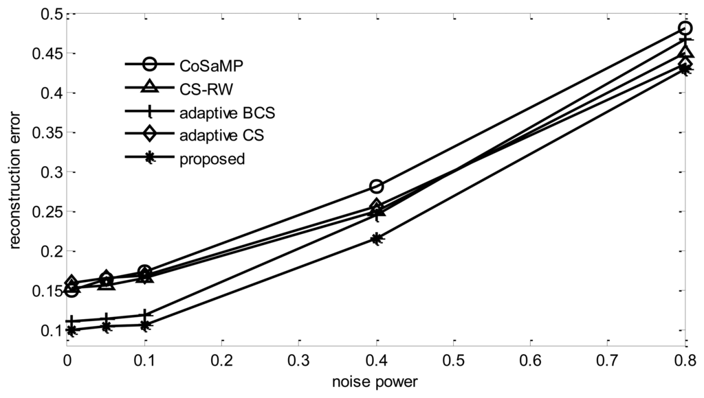 From Figure 9, it can be found that, when the data is contaminated by noise, reconstruction Bayesian-based algorithms outperform CoSaMP [23]. Meanwhile, when the number of collection rounds is fixed, the reconstruction error will increase with the increase of node number N. Among all five algorithms, the proposed algorithm performs the best. When N = 400, it can reduce the reconstruction error by 2.3% in comparison with adaptive BCS. Although the adaptive method is utilized in adaptive BCS too, its performance is worse than that of the proposed algorithm, due to the fact that the Bayesian learning process is likely to choose the same basis, which leads the algorithm to fall into a local minimum [24]. Although a random noise disturbance can be added to the vector to help the learning process jump out of local minima, the performance improvement is limited while the energy cost increases dramatically. In the figure, it can be found that adaptive CS always performs the worst among the five algorithms. This is due to the fact that this algorithm tends to choose only one node in a sink's one hop neighbors as its target node. The reason for this is that adaptive CS uses Δh(p) / ΔE(p) as a metric to select the path. As E(p) is counted in the hop, when the path length increases from 1 hop to 2 hop, E(p) increases once. However, as data from neighbor nodes has a strong correlation, in most cases, the increase of information Δh(p) can't increase once. Therefore, adaptive CS tends to choose only one node among the sink's one hop neighbors.