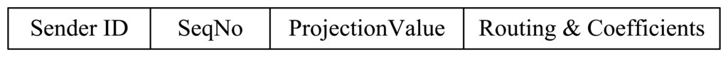 As is shown in Figure 7, the SenderID field contains the ID of the node that sends the current packet. SeqNo field is used to uniquely identify one collection round. Due to the broadcast nature of the wireless channel, all neighbors of a sender can receive its packet. This feature can be utilized to improve energy efficiency. When receiving a packet, a node (assumed to be νi) checks the Routing & Coefficients field to determine if it is one of the children of the sender. If it is false, the packet will be dropped, otherwise νi finds out its projection coefficient ri in the packet and updates the Projection Value field using: