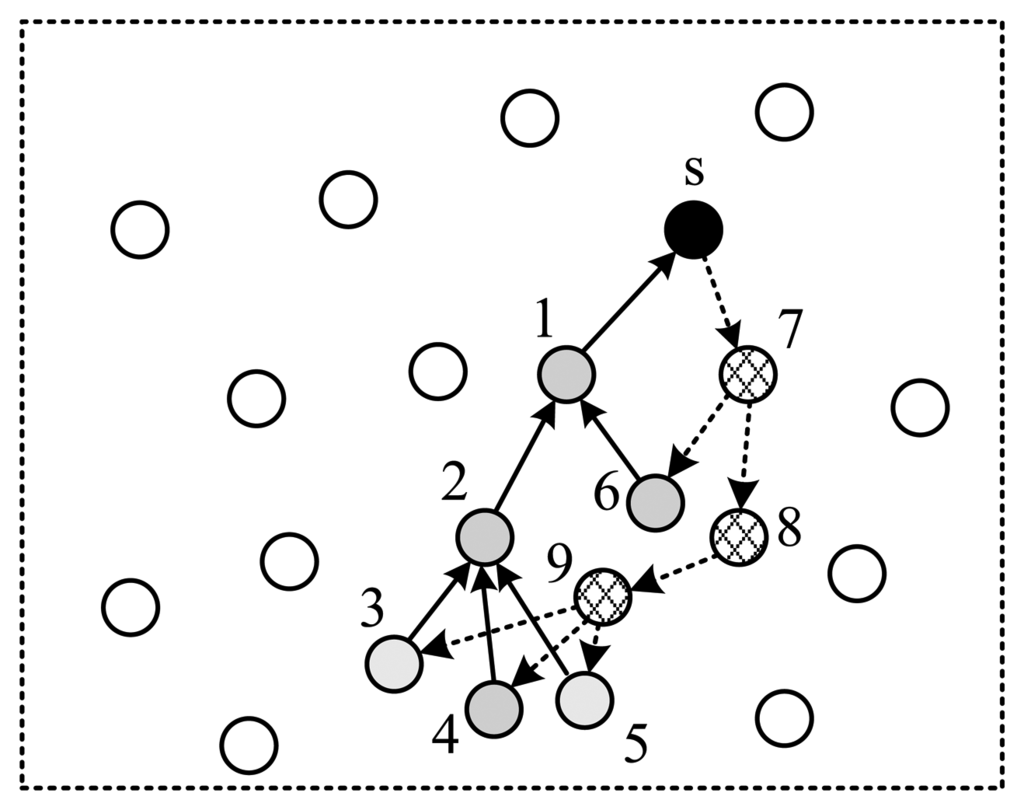 To shorten the time spent for one collection round, the structure shown in Figure 5 utilizes a tree structure. Like structure 1, data packets pass a same node twice. The structure shown in Figure 6 uses a multi-ring structure to arrange the selected nodes. Packets are duplicated into multiple copies in case of necessity utilizing the broadcast property of wireless channels to speed up the collection process. Meanwhile, multiple copies of the packet are reunited when necessary to save energy. This structure takes the advantage of the structures proposed in Figures 4 and 5, and has the virtue of both energy efficiency and short collection path. In this paper, we propose to design a multi-ring routing structure as shown in Figure 6.
