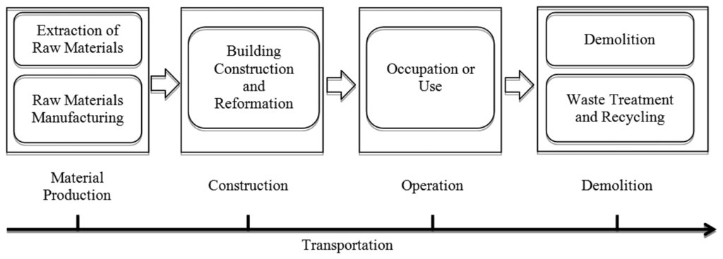 Adalberth presented a method on how to calculate the energy use during the life cycle of a building [11]. Seo and Hwang divided the life cycle of a residential building into four stages (manufacturing, construction, operation, and demolition) for estimating CO2 emissions [12]. Blengini estimated carbon emissions derived from three distinct phases: pre-use, use and end-of-life [13]. Erlandsson and Borg divided LCA for buildings into a linear life cycle and a sequential life cycle [14]. Malmqvist et al. adopted a systematic approach guiding the user through the life cycle process and clarifying key issues that usually cause difficulty [15]. Chen et al. presented a low-carbon building evaluation framework detailing carbon emission account procedures for the life cycle of buildings in terms of nine stages of building construction, fitment, outdoor facility construction, transportation, operation, waste treatment, property management, demolition, and disposal for buildings [16].