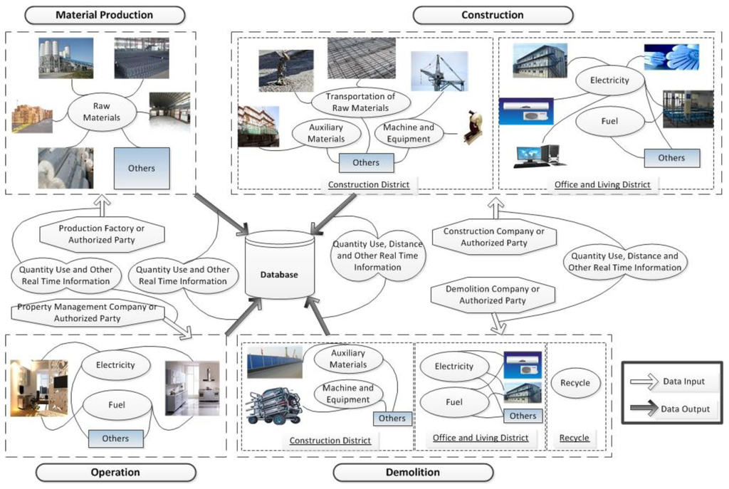 In the stage of material production, the data of quantity of raw materials used, including concrete, cement, brick, steel, timber, glass, plastic and so on, is maintained by the production company, which is also required to exchange the data based on real-time information with a database that will be used for the backup and calculation of energy consumption and carbon emissions. Considering the nature of non-profitability of carbon emission at a company level, we expect such a database to be maintained by some authority department, construction association or authorized non-government organizations. The structure and details of the database is out of the scope of this paper.
