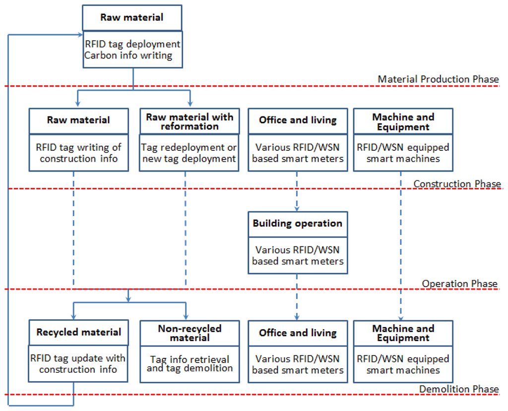 In our design, we adopt the data-on-tag concept to record on the RFID tags the carbon emission information relevant to each specific unit of building material. This is achieved by recording every activity carried out to the material and its corresponding carbon emission figure in the RFID tag's “user data” memory. Such information could then be deemed as an accurate “carbon footprint” record of the material, and should be updated at each check point, where the tag is to be accessed by a RFID reader device, during the material's life cycle. In addition to just reading out the identity stored in the tag, the reader device at each check points would read out the recorded “carbon footprint” and also update it with any available new entries.