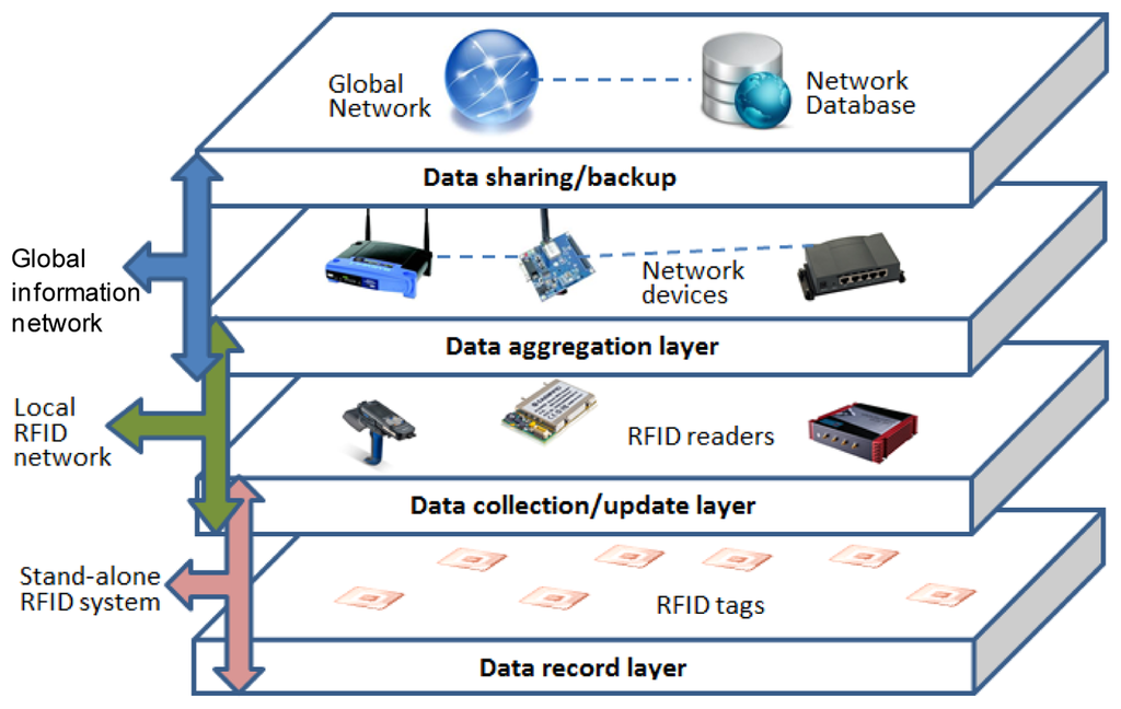 RFID technology on its own just performs the information transmission between tags and reader at check points. The real potential of such information can be extracted only when it is supported or been used to support a larger system that maintains a central view of the scenario/application. This requires the RFID reader devices to be integrated with an information management system and to be capable of retrieving data from or injecting data into the system's network backbone. Such integration usually leads to the so-called “Networked RFID System”. In fact, network device and platforms have long been identified as a significant part of RFID system spending, together with tags and readers [51].