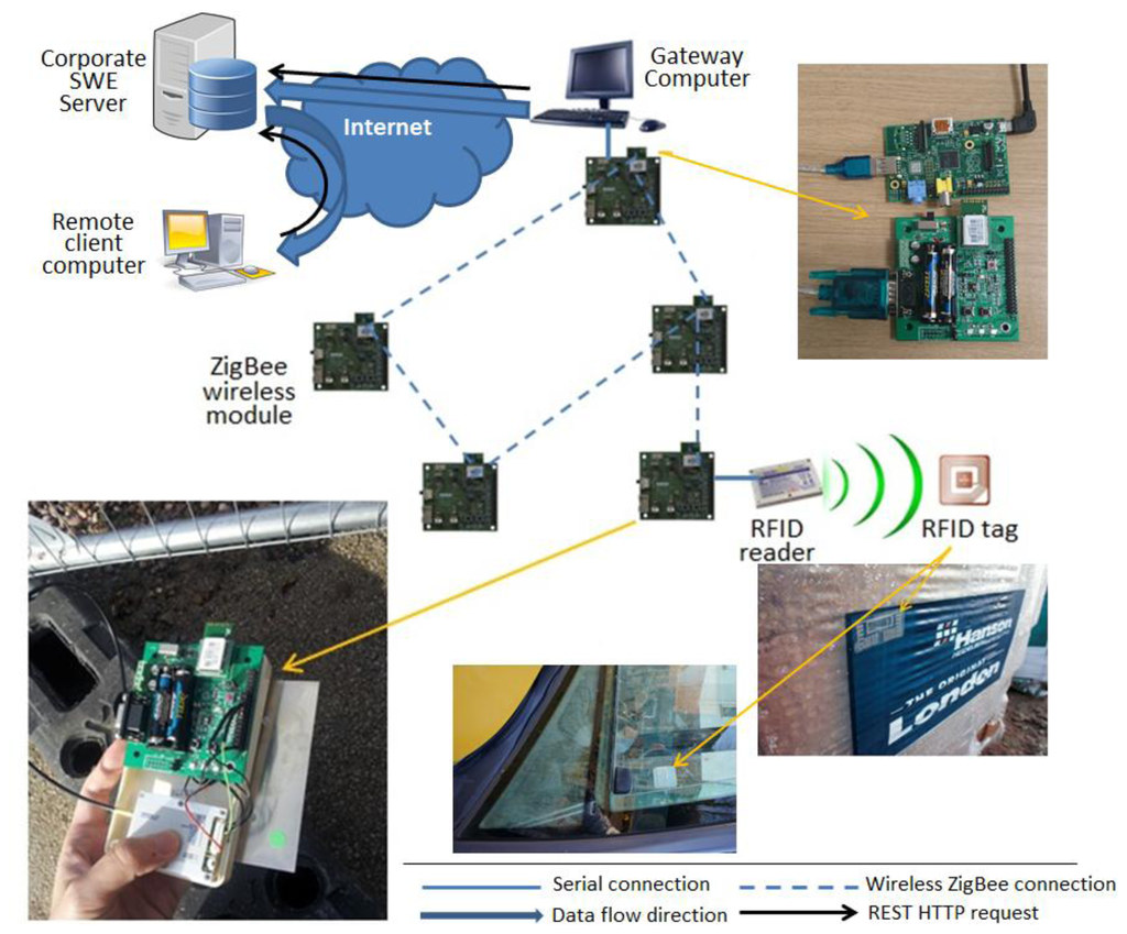 Figure 5 shows the system deployment of this experiment. On initialization phase the corporate server is first started with the SWE server services online. The gateway computer(s) then goes onlive and registers themselves with the corporate server. After that the ZigBee coordinator establishes the sensor network, followed by the joining of the other four modules, all of whom act as ZigBee routers. The ZigBee RFID reader device then starts working and reports back to the coordinator, who sends updates to the gateway computer regularly. In this particular demonstration system the new RFID reader is identified in the updates therefore the gateway computer registers the reader as a new sensing device to the corporate server, where the it can then be assigned a roll such as an access point, a driver's mobile reader or even a smart meter. Any tag reading and its accompanying information (e.g., transport distance of and activities performed on the piece of material represented by the tag read by a driver's or access point's reader) from it afterwards is then updated to the gateway device and injected to the corporate SWE server by making REST HTTP queries with the data in XML serialization complied to the SWE specifications. The information injected and stored on the SWE server then undergoes predefined process, in our case a conversion of some received information to carbon emission figure. The remote client computer can then send standard SWE-complied REST HTTP queries to the corporate server to request any information that it is interested in. To illustrate the building life cycle we are able to perform identity retrieving on wood and concrete materials and construction machines, activity and carbon emission data writing and third party querying, which are the common tasks that can happen in all phases in the cycle. We believe such demonstration system shows the technical feasibility of our proposed architecture and a possible way of implementation, for which other methods of implementing data modelling and serialization exists, such as W3C-SSN and JSON etc., but the system architecture remains as what we have proposed regardless of which implementation methods is adopted.