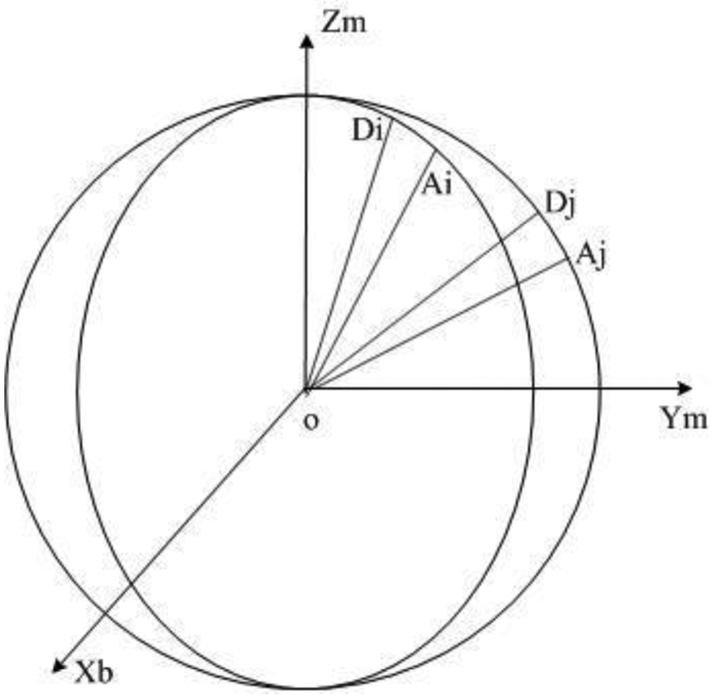 The transition matrix defined in [12] between the sensor coordinate system and body system contains six unknown parameters. This matrix completely describes the non-orthogonal error and misalignment error and adopts the “three-step” algorithm in magnetometer pre-calibration before flight, without reference to any direction information. The misalignment rotation matrix can be derived from the condition that the vertical component of the geomagnetic field remains unchanged while rotating the magnetometer respectively around the x-axis, y-axis, and z-axis in the geoid. It is proposed in [13] that the rotation matrix of the misalignment error could be obtained when the sensor rotates around an axis, and the projection of the magnetic field output is invariable, which lies on the plane that is perpendicular to the said axis. This method is more valuable in engineering as it is unnecessary to keep leveling. This paper is based on the constant intersection angle between the geomagnetic field vector and gravitation field vector [14], without additional independent calibration and coordinate system conversion, and seeks to derive a rotation matrix more conveniently, furthering the compensation of magnetic field measurement error and heading error.