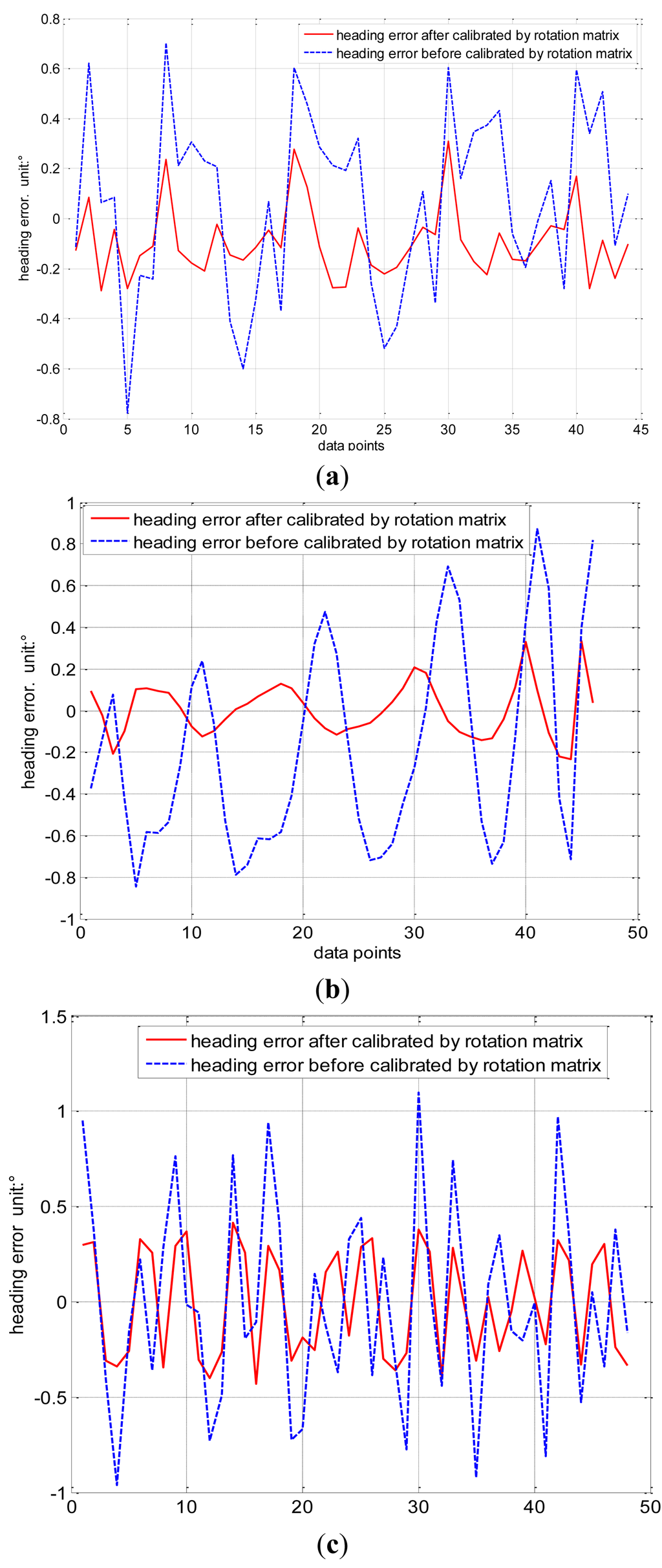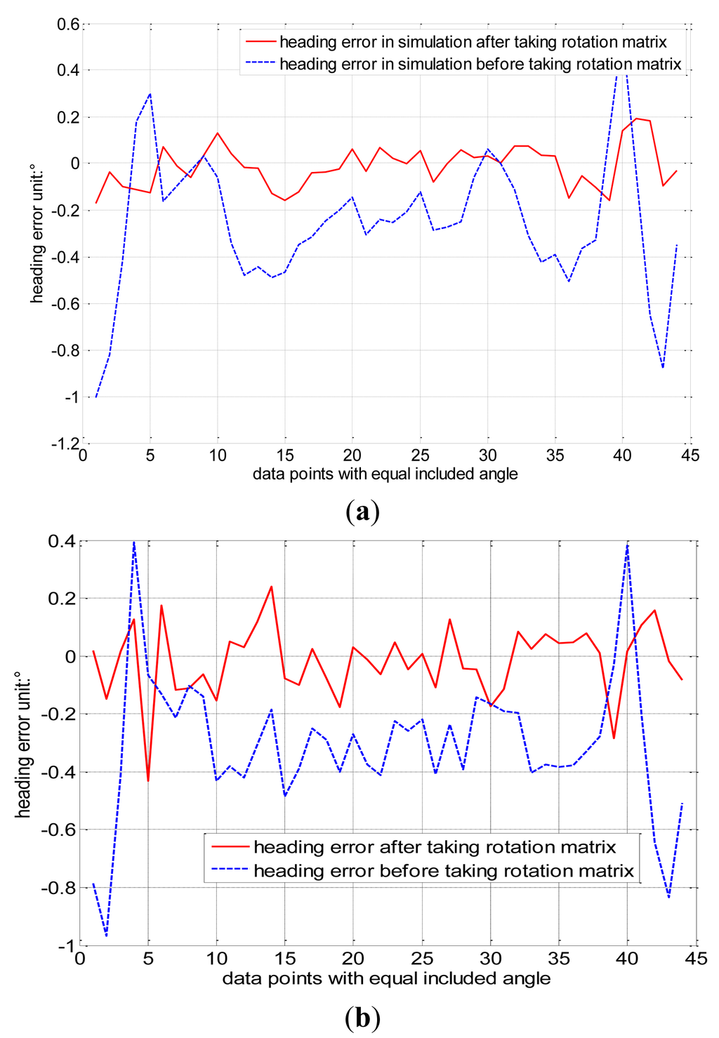 The calibration matrix G of Equation (18) is derived from the ellipsoid coefficient matrix by eigen-value decomposition and singular value decomposition in the classical ellipsoid fitting method. Then G is introduced into Equation (20) to calibrate the measurement of the geomagnetic field Hm and obtain Hc calibrated by the classical ellipsoid fitting method. However, calibration matrix G is not the actual calibration matrix, which should be multiplied by the rotation matrix R mentioned earlier. R is obtained using the constant intersection angle method to further improve the accuracy of magnetic sensor. This method can be used to other type of three-axis inertia sensor including misalignment error. Then, the complete calibration geomagnetic field He = R · Hc is obtained. The heading error is shown in Figure 8a. The red solid line refers to the heading error calibrated by the constant intersection angle method, which is less than ±0.3°, and the blue dashed line refers to the heading error calibrated by the classical ellipsoid fitting method, which is within the range of ±0.8°.