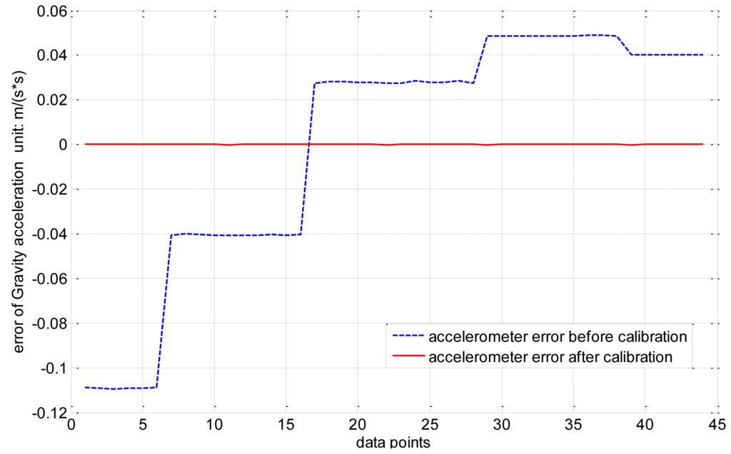 The output trajectory of the three-axis accelerometer accords with the ellipsoid hypothesis as well. There are nine unknown parameters consisting of three sensitivity errors, three non-orthogonal error and three bias. Thus, the error parameters of the accelerometer can all be derived from the coefficients of the ellipsoid equation. The experiment is performed on the turntable shown in Figure 6 by mounting the magnetic compass on the aligned turntable, aligning the body frame of the magnetic compass with the turntable by using the location pins, and then rotating the turntable to different angular positions. The results in Figure 7 show that the absolute error declines from 0.1582 m/s2 to 4.6323 × e−4 m/s2, and the mean square root error drops from 0.0545 m/s2 to 1.0358 × e−4 m/s2; thus, the maximum error of the accelerometer can be reduced by a factor of approximately 1,000.