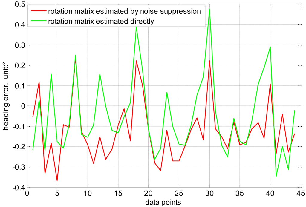 The green line refers to the heading error that the rotation matrix R is estimated directly by the measurement data; the red line is the heading error that the estimation of R is adopted the noise suppression methodology. It can be seen from Figure 9 that the heading error decrease from ±0.48° to ±0.32°.