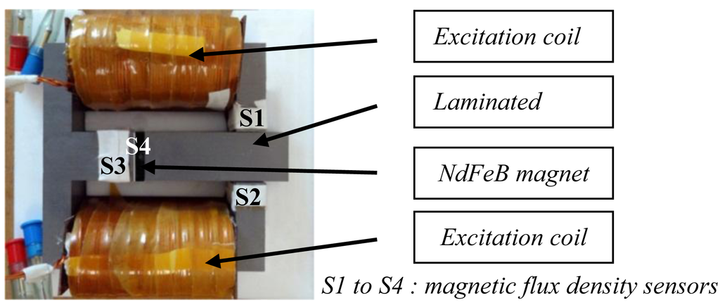 In practice, the direct measurement of eddy current losses in the permanent magnet cannot be easily achieved. Indeed, the total losses Pt are composed of the copper losses PCu of both excitation coils, iron losses Piron of the laminated core and eddy current losses PPM in the permanent magnet as given in Equation (1). The copper losses can be deduced from direct measurements using Equation (2):